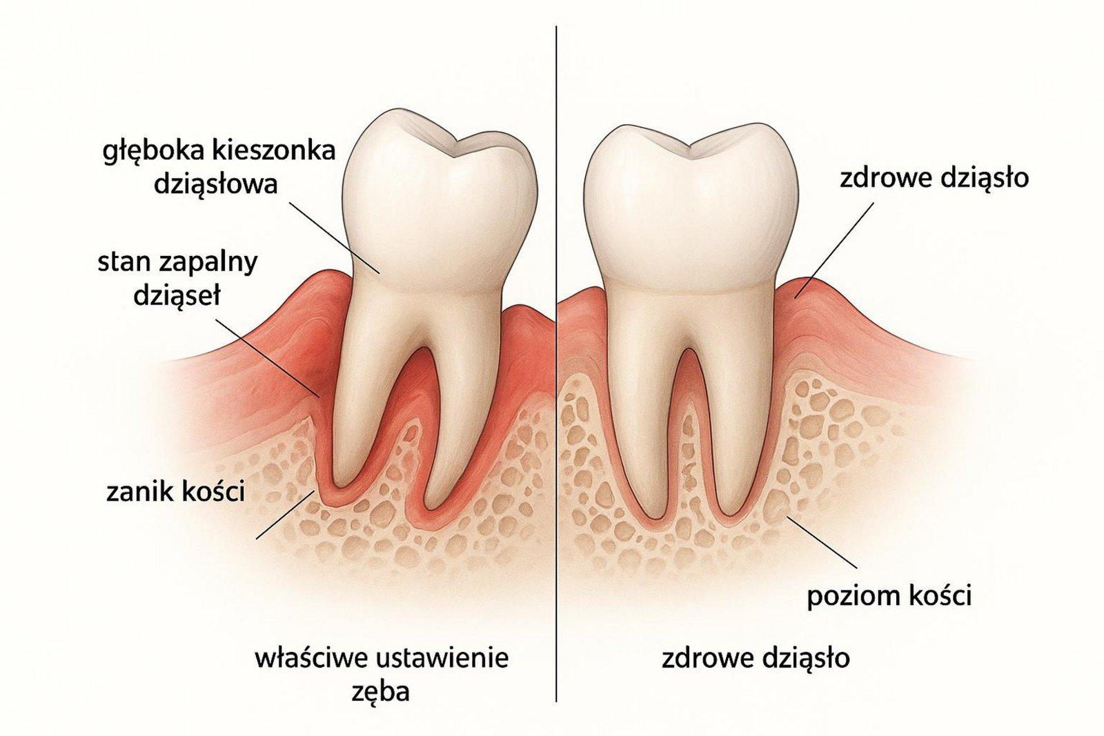 Błędny zgryz często powoduje tzw. urazy zgryzowe, które osłabiają aparat utrzymujący ząb w kości. Jeśli ząb jest ustawiony pod złym kątem, siły żucia „wpychają” bakterie coraz głębiej w kieszonki dziąsłowe. Pojawia się stan zapalny z zaczerwienieniem, obrzękiem i krwawieniem przy szczotkowaniu.